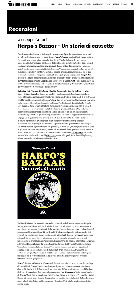 Il 1977 a Bologna: una polveriera. Un crogiuolo di creatività, frequentato da pazzi di ogni risma, geni incontrollabili, indiani più o meno metropolitani e rivoluzionari di professione. Sullo sfondo, una colonna sonora adatta a tempi a dir poco inquieti. Confezionata dalla Harpo’s Bazaar, nient’altro che una cooperativa nata con lo scopo di incidere sul linguaggio del cinema, della grafica, della musica. Soprattutto della musica. Tanto da creare una divisione adatta alla bisogna: la Harpo’s Music. Nove gli album pubblicati, tra il 1977 e il 1979, dalla piccola etichetta bolognese, nove cassette (sì, cassette!) entrate di diritto tra le pagine di storia. Il rock demenziale degli Skiantos, il punk rock dei Luti Chroma, l’energia dei Windopen, il prog dei Naphta, il punk pestone dei Gaznevada e di Sorella Maldestra, il resoconto live della storica rassegna Bologna Rock, le sperimentazioni di Albert Mayr e Stefano Barnaba: il libro che avete tra mani ricostruisce la storia e la genesi di questi nove album seminali (non dimenticando l’esperienza del Treno di John Cage, che vide la Harpo’s Bazaar in prima linea) intrecciandole con le vicissitudini dell’epoca e con interviste ai protagonisti. Ne esce fuori un racconto corale, la fotografia di un'epoca meravigliosa che, con ogni probabilità, non si ripeterà più.